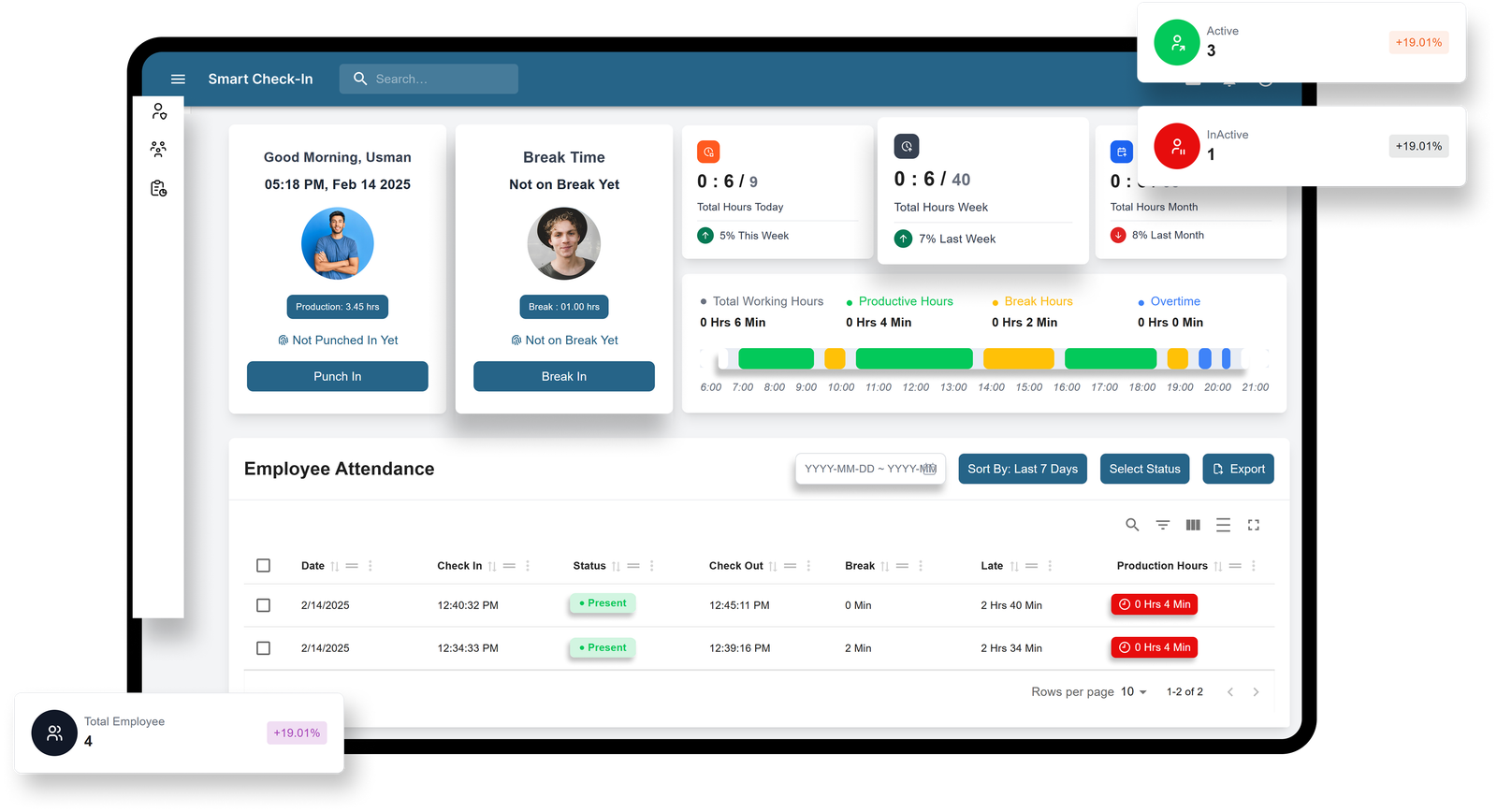Smart Check-In is a comprehensive employee tracking and attendance management system designed specifically for IT companies. It ensures efficient workforce management by providing real-time insights into employee check-ins, check-outs, breaks, working hours, and leave permissions.
