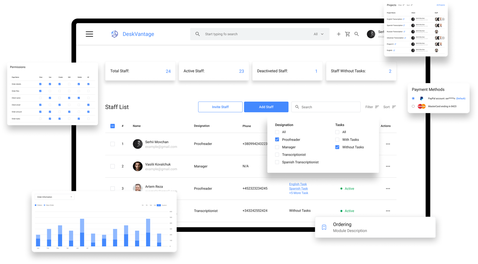 I had the opportunity to work on DeskVantage, a scalable SaaS platform designed to optimize business operations through advanced user management, reseller control, and secure role-based access. Built for high-performance and flexibility, DeskVantage enables organizations to manage staff, clients, and sub-users with complete permission control and integrated business tools.